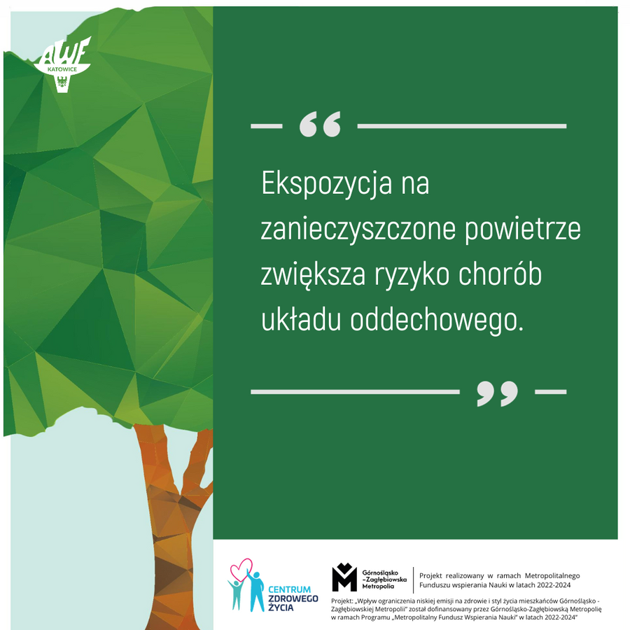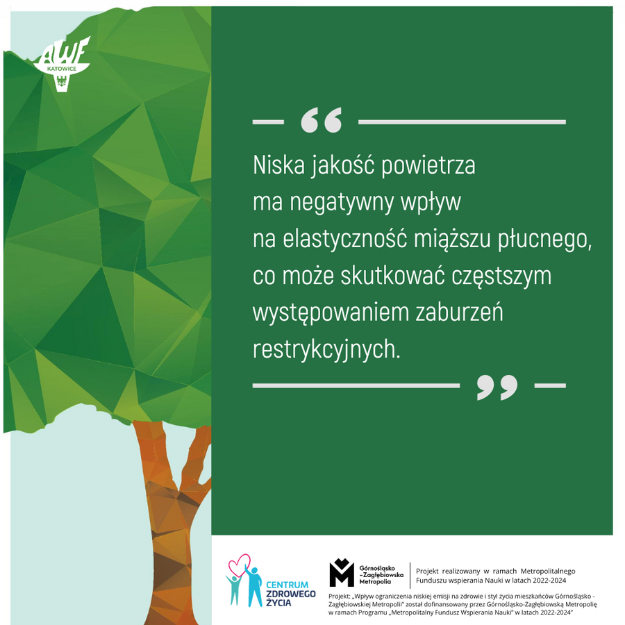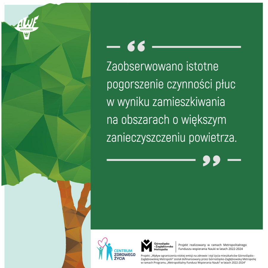 Projekt: „Wpływ ograniczenia niskiej emisji na zdrowie i styl życia mieszkańców Górnośląsko - Zagłębiowskiej Metropolii” został dofinansowany przez Górnośląsko-Zagłębiowską Metropolię w ramach Programu „Metropolitalny Fundusz Wspierania Nauki” w latach 2022-2024” zgodnie z umową o przyznanie dotacji numer nr RW/57/2023.