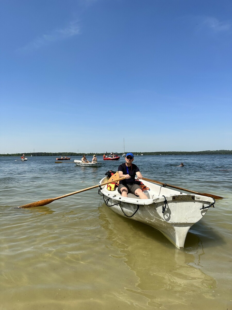 4) przepłynięcie w czasie nie dłuższym niż 2 min 40 s ratowniczą łodzią wiosłową za pomocą dwóch wioseł dystansu 75 m w linii prostej do boi (pławy), na dopłynięciu do niej rufą i na powrocie do miejsca startu za pomocą jednego wiosła;