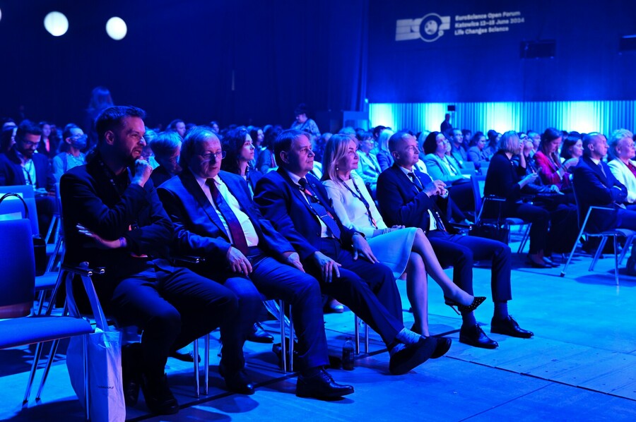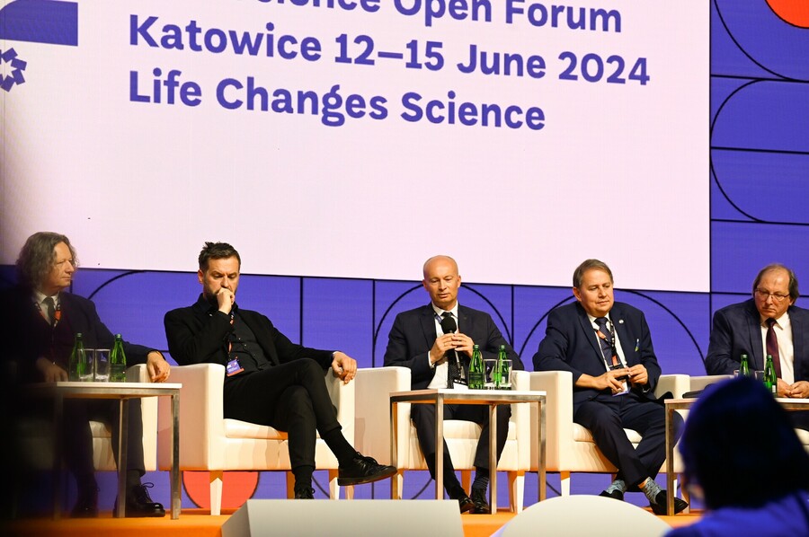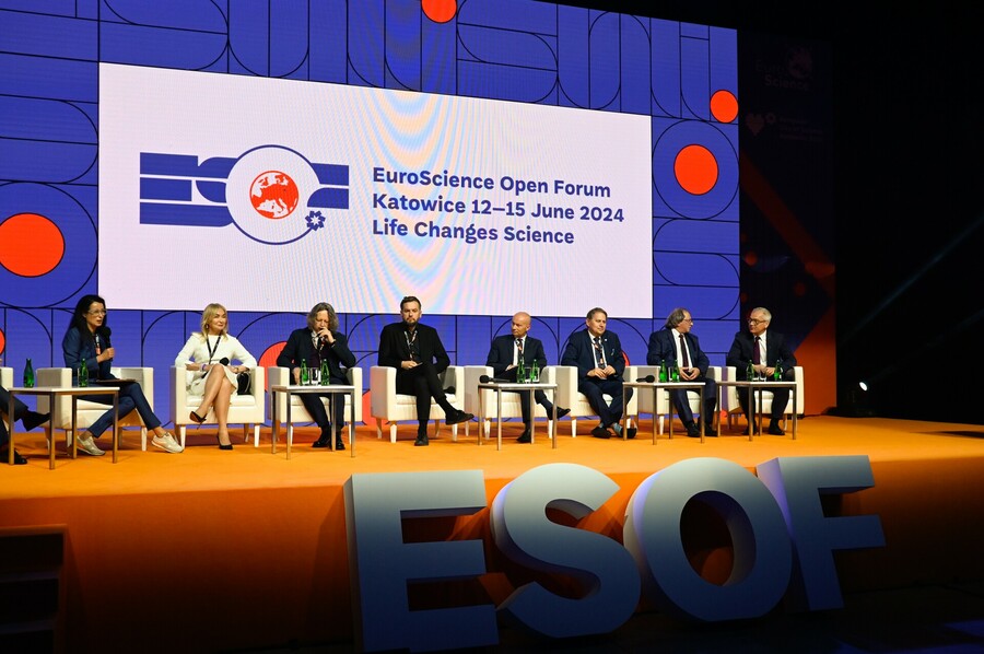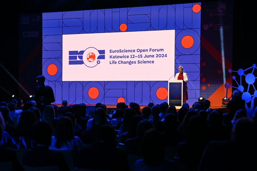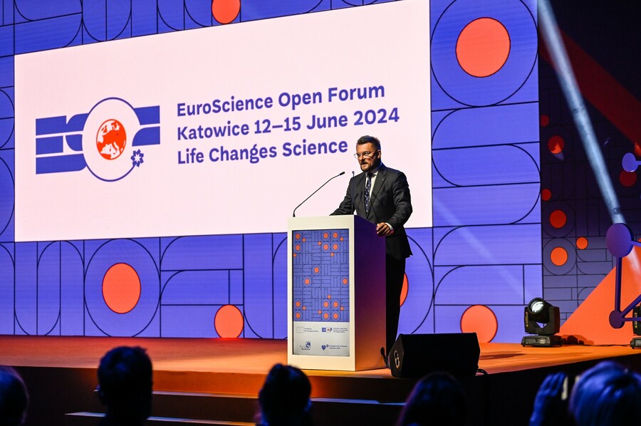 Uroczystej ceremonii otwarcia dokonali: Prezydent Miasta Katowice Marcin Krupa, Maria Mrówczyńska - Wiceminister Nauki, Rektor Uniwersytet Śląski w Katowicach Ryszard Koziołek, Champion ESOF 2024 Anna Budzanowska, Head of Unit A2 - ERA Manuel Aleixo, Dyrektor Departamentu Edukacji i Spraw Społecznych Anna Kwaśniewska, Wojewoda Śląski Marek Wójcik oraz Przewodniczący Zarządu GZM Kazimierz Karolczak.