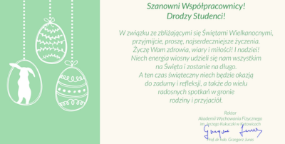 Szanowni Współpracownicy! Drodzy Studenci! W związku ze zbliżającymi się Świętami Wielkanocnymi, przyjmijcie, proszę najserdeczniejsze życzenia. Życzę Wam Zdrowia, wiry i miłości! I nadziei! Niech energia wiosny udzieli się nam wszystkim na Święta i zostanie na długo. A ten czas świąteczny niech będzie okazją do zadumy i refleksji, a także do wielu radosnych spotkań w gronie rodziny i przyjaciół.
