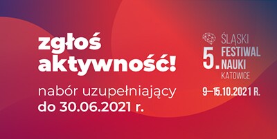 Informujemy, że ruszył uzupełniający nabór aktywności, które będzie można zaprezentować festiwalowej publiczności. Za pomocą specjalnego formularza (rejestracja-sfn.us.edu.pl/) ponownie można zgłaszać aktywności do programu święta śląskiej nauki. Zachęcamy do nadsyłania propozycji wykładów, warsztatów, stanowisk pokazowych, wystaw oraz wszelkich innych form popularyzatorskich. które wzbogaciłyby festiwalowe obszary wiedzy (nauk humanistyczno-społecznych, medycyny i zdrowia, sztuki p