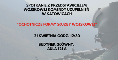 Drodzy Studenci Bezpieczeństwa Wewnętrznego AWF Katowice ! Już w przyszły czwartek 21 kwietnia o 12:30 w Auli 121 A w Budynku Głównym odbędzie się spotkanie z przedstawicielem Wojskowej Komendy Uzupełnień pt.: "Ochotnicze formy służby wojskowej". Gospodarzem wydarzenia będzie Pan por. Paweł Mikołajec. Serdecznie zapraszamy do uczestnictwa :)