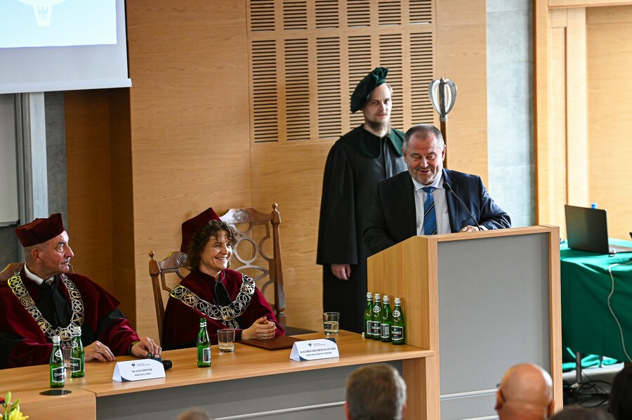 Prof. Adam Zając - Prezes Klubu Sportowego AZS AWF Katowice, a jednocześnie Prorektor ds. Sportu ogłosił przyznanie tytułu Honorowego Prezesa Klubu Sportowego AZS AWF Katowice Panu Profesorowi Stanisławowi Sosze. W imieniu wyróżnionego, akt odebrała Pani Profesor Teresa Socha, która podziękowała w imieniu męża za ten zaszczytny tytuł.