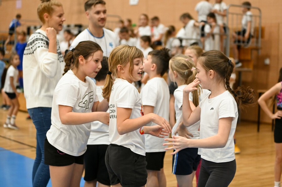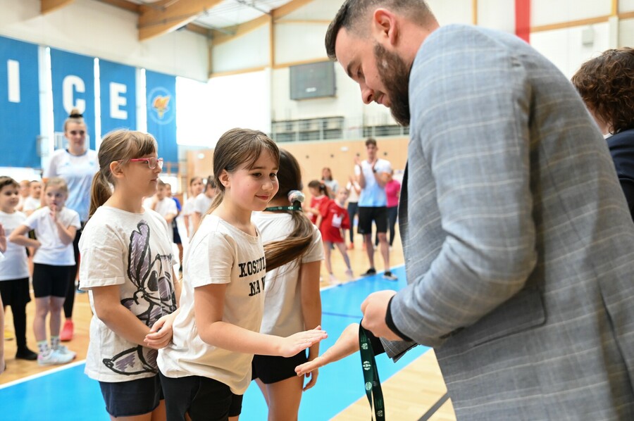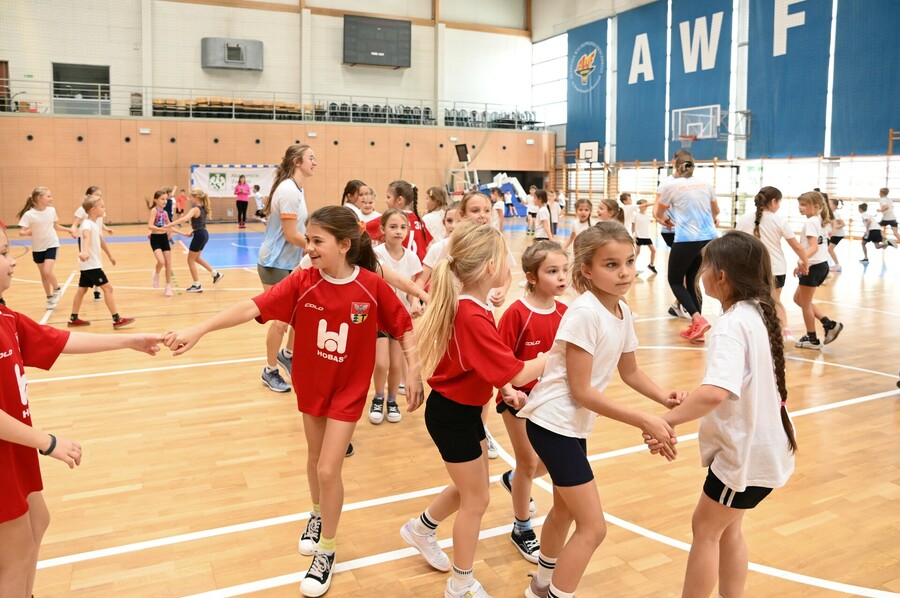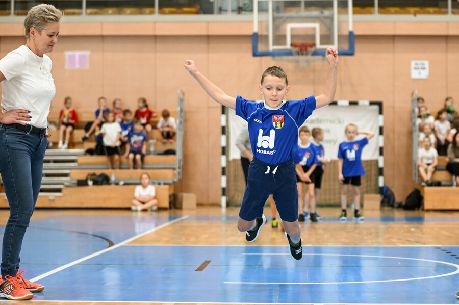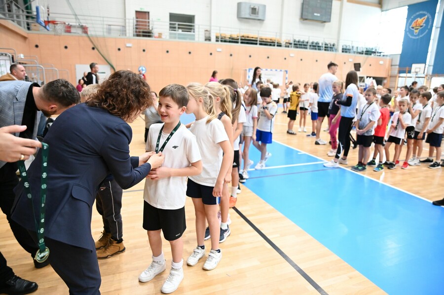 Poza samą rywalizacją, dla naszych gości przygotowaliśmy wspólną rozgrzewkę, a czas oczekiwania na wyniki urozmaiciła im wspólna zabawa w hali, podczas której tańczyliśmy m.in. belgijkę. Każdy uczestnik zawodów otrzymał pamiątkowy gadżet, zdrowy poczęstunek oraz medal Mistrzów Pokoleń. Ceremonię dekoracji uświetnił swoją obecnością Jurek – maskotka AWF Katowice.