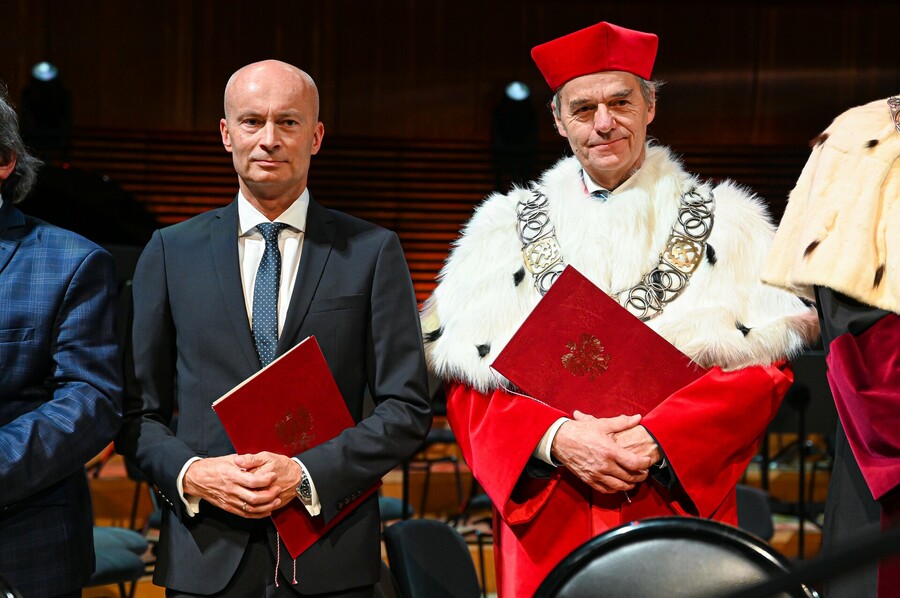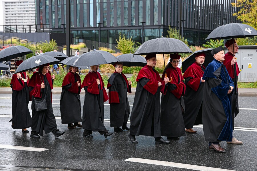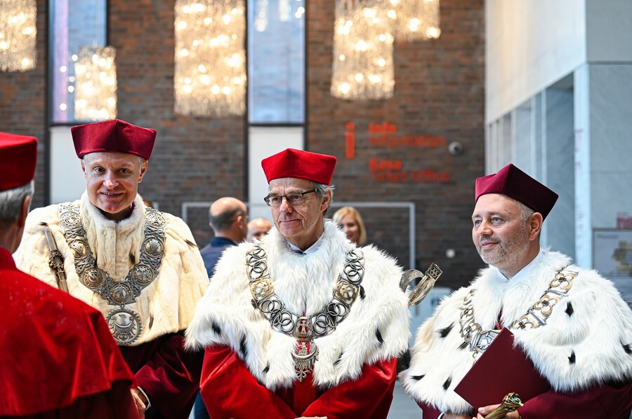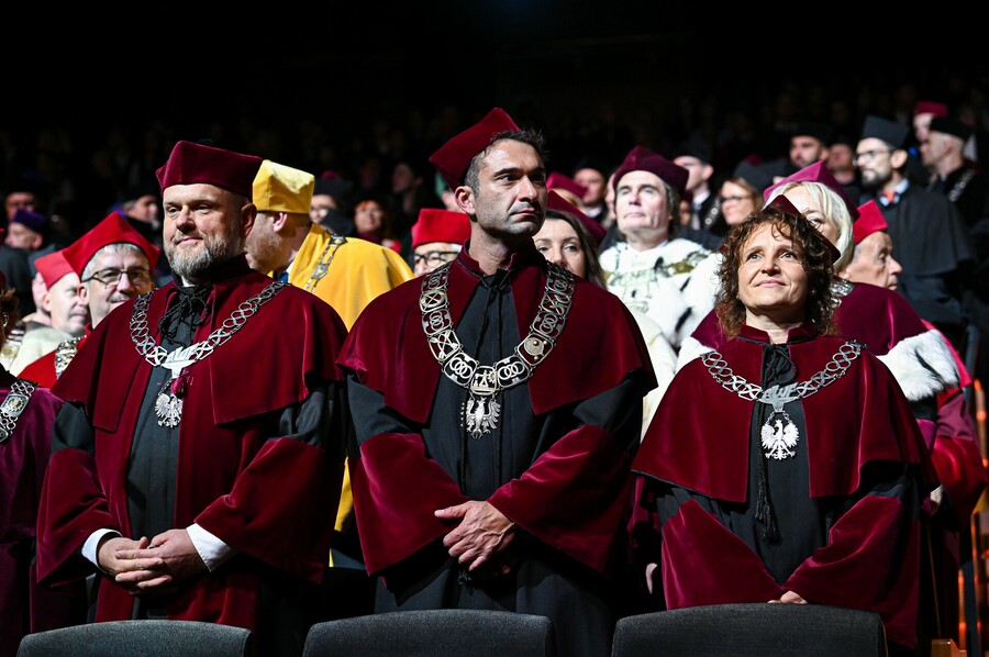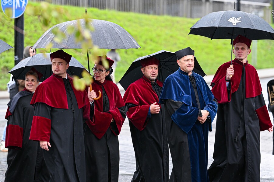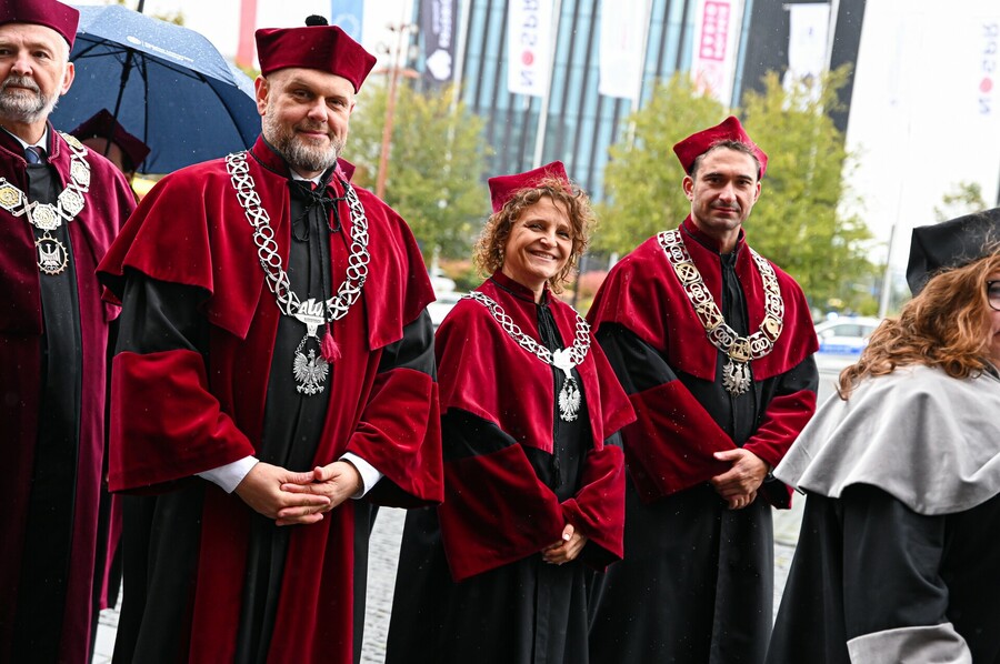 W wyjątkowej atmosferze odbyła się Międzyuczelniana Inauguracja Roku Akademickiego 2025/2026 w Katowicach. Choć główna część jednego z najważniejszych wydarzeń dla śląskich uczelni publicznych rozpoczęła się o godz. 16:00 w sali koncertowej Narodowej Orkiestry Symfonicznej Polskiego Radia, już od samego rana na wszystkich uczestników czekała moc atrakcji w miasteczku naukowym na katowickim Rynku. Każda z uczelni Konsorcjum Akademickiego – Katowice Miasto Nauki przygotowała własne stoisko z licznymi pokazami i warsztatami naukowymi. Akademia Wychowania Fizycznego im. Jerzego Kukuczki zaoferowała na swoim stanowisku możliwość wykonania szybkich i bezpiecznych testów zdrowia oraz siły (oceny składu ciała, BMI, nawodnienia, wieku metabolicznego, siły mięśni). Otrzymane wyniki można było skonsultować z ekspertami AWF, przy okazji uzyskując praktyczne wskazówki, jak zadbać o kondycję, zdrowie i dobre samopoczucie. Ponadto na uczestników wydarzenia czekały stanowiska Sieci Badawczej Łukasiewicz – Instytutu Sztucznej Inteligencji i Cyberbezpieczeństwa, atrakcje przygotowane przez Polskie Radio Katowice, a także mobilna scena Miasta Nauki, a w jej ramach debaty oraz wykłady popularnonaukowe. Na kilka godzin serce Miasta przeistoczyło się w jedyną w swoim rodzaju przestrzeń inspirujących spotkań z nauką. Zwieńczeniem tej części akademickiego święta były występy artystyczne zespołów akademickich oraz tradycyjny przemarsz orszaków rektorskich ulicami Katowic w kierunku siedziby Narodowej Orkiestry Symfonicznej Polskiego Radia, gdzie miała miejsce oficjalna część uroczystości.