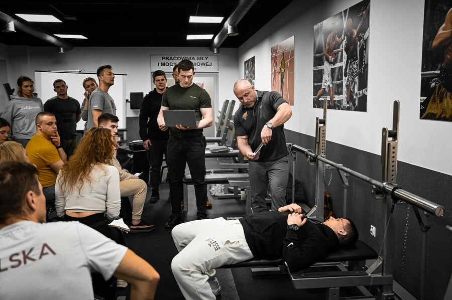 w diecie" prowadził dr Mateusz Gawełczyk z AWF Katowice. Kolejne szkolenie „Velocity based training — praktyczne monitorowanie możliwości wysiłkowych zawodnika w warunkach treningowych — przedstawili dr hab. Michał Wilk prof. AWF i mgr Dawid Gaweł AWF Katowice. O „Blood flow restriction” - optymalizacji parametrów stosowania metody ograniczonego przepływu krwi podczas treningu oporowego opowiedzieli dr hab. Michał Krzysztofik prof. AWF i dr Jakub Jarosz AWF Katowice. Kompleksowe omówienie teoretycznych i praktycznych aspektów trzech powyższych tematów pozwoli kursantom uzupełnić i wzbogacić wiedzę, co z pewnością przełoży się na efekty pracy.