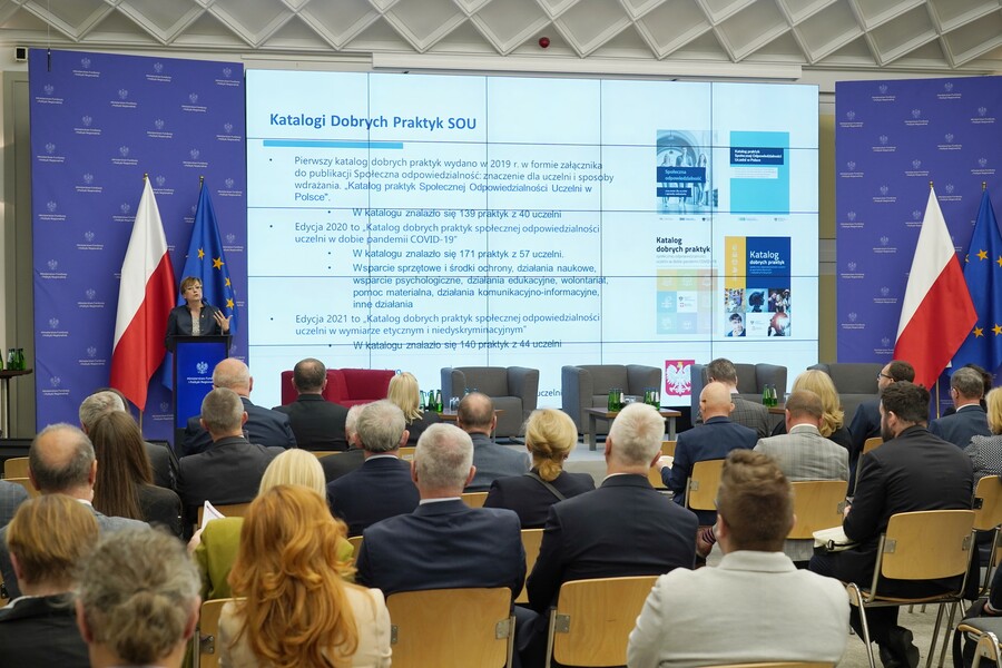 Podczas konferencji rozmawiano o Deklaracji SOU, efektach działania Grupy roboczej ds. SOU oraz zaprezentowano przykłady wdrażania zasad SOU zebrane w trzech katalogach dobrych praktyk publikowanych przez MFiPR od 2019 r. Swoją premierę miał również Katalog Dobrych Praktyk Uczelni za rok 2021.