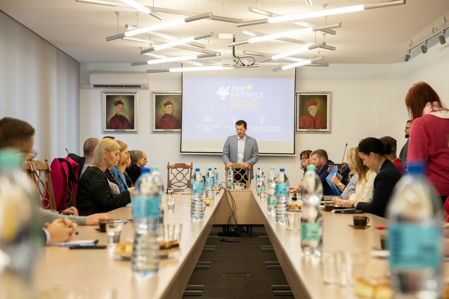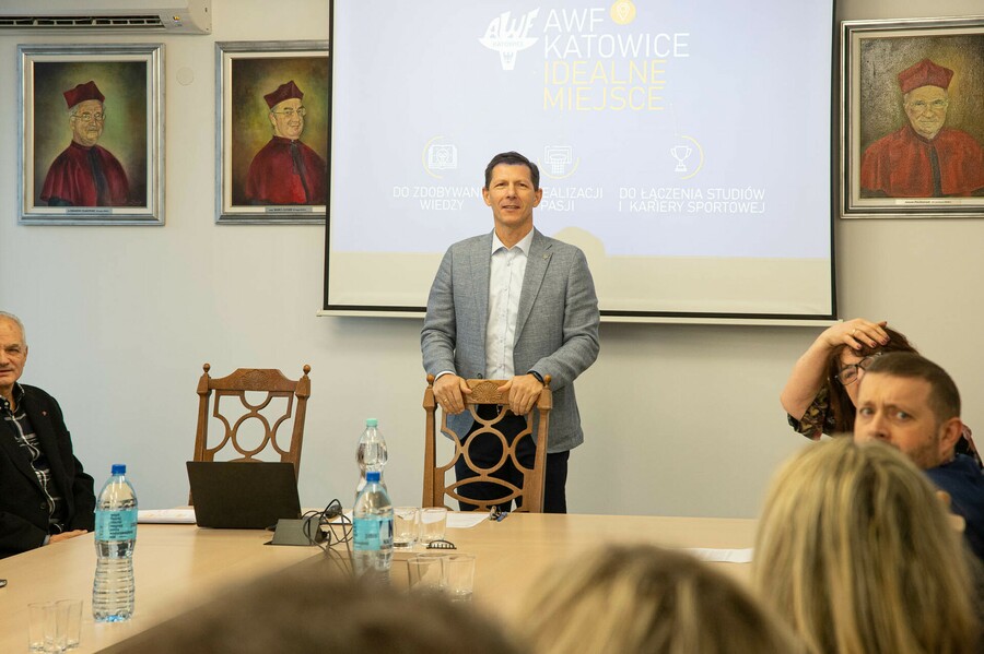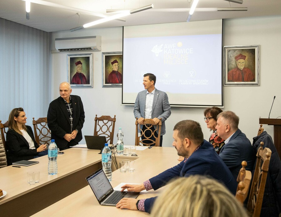 W dniu 30 listopad br. w AWF Katowice odbyło się spotkanie z przedstawicielami zaprzyjaźnionych szkół średnich z województwa Śląskiego. Spotkanie poprowadził Prorektor ds. promocji i sportu dr hab. Arkadiusz Stanula, prof. AWF. Celem spotkania było przybliżenie oferty kształcenia AWF Katowice. Przedstawiciele wydziałów – dr Krystyna Kwaśna, dr Wiesław Garbaciak oraz dr Wojciech Chudy, zaprezentowali ofertę kształcenia na poszczególnych wydziałach oraz opowiedzieli o nowych kierunkach, których uruchomienie jest planowane na rok 2023/2024. Na spotkaniu omówiono również możliwe formy promocji AWF Katowice wśród uczniów szkół średnich.