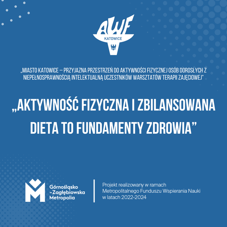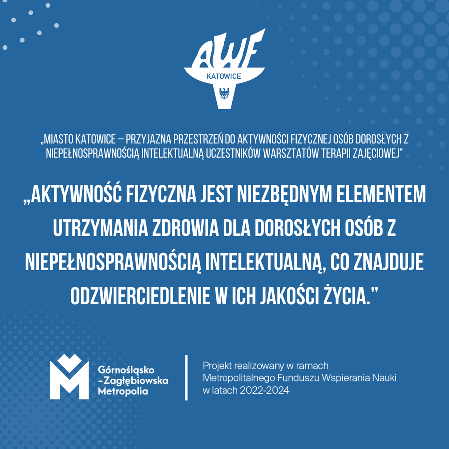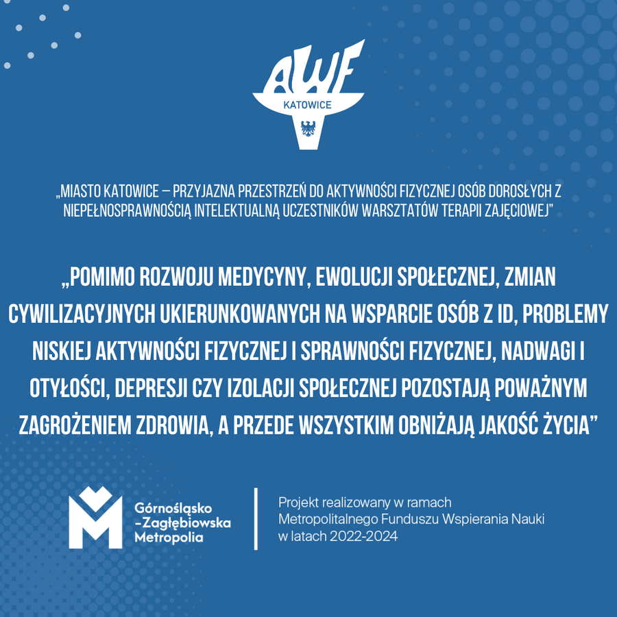 Projekt „Miasto Katowice – przyjazna przestrzeń do aktywności fizycznej osób dorosłych z niepełnosprawnością intelektualną uczestników Warsztatów Terapii Zajęciowej” został dofinansowany przez Górnośląsko-Zagłębiowską Metropolię w ramach Programu „Metropolitalny Fundusz Wspierania Nauki” w latach 2022-2024” zgodnie z umową o przyznanie dotacji numer nr RW/56/2023.